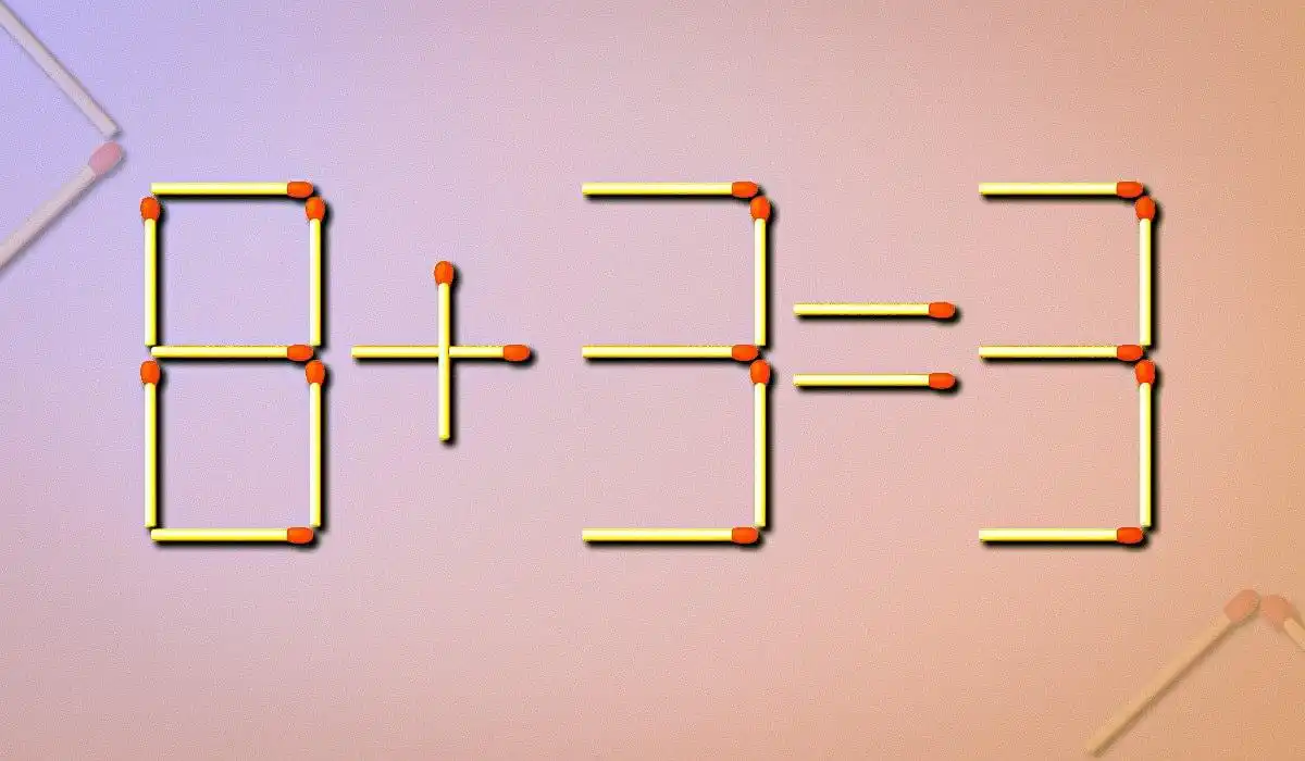 Nell’immagine qui sotto vedrete l’uglianza 8+3=3 disposta con i fiammiferi. C’è un errore che dovete correggere.