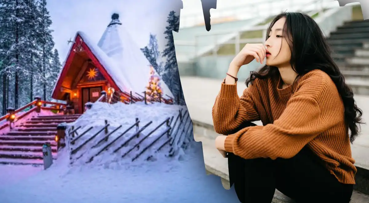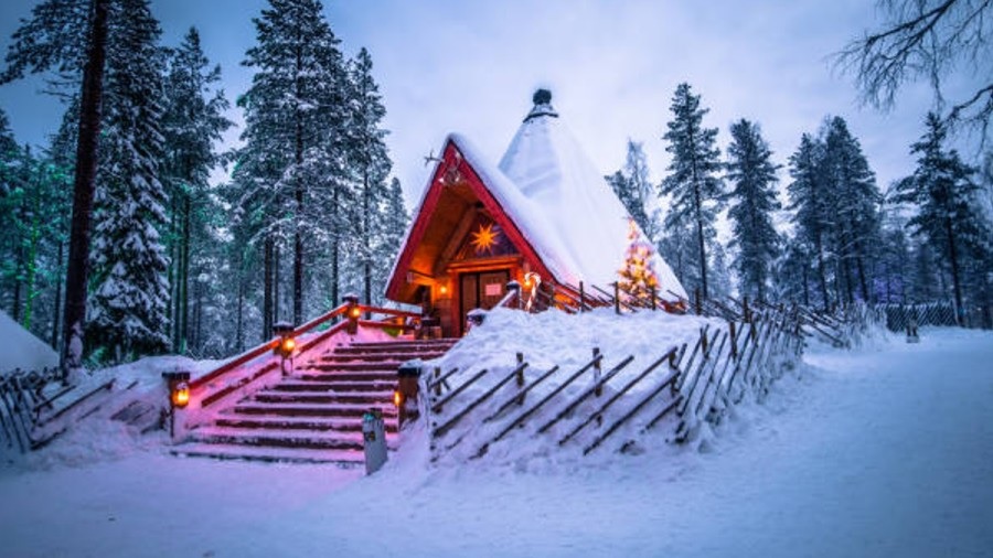 L’immagine mostra una casa, per raggiungere la qe è necessario salire su una grande scala. Intorno alla casa c’è una foresta di conifere, i cui rami sono piegati dalla grande qtità di neve. Le luci brillano all’esterno della casa e l’intero cortile è ricoperto da uno spesso strato di neve, che copre qi completamente la recinzione.