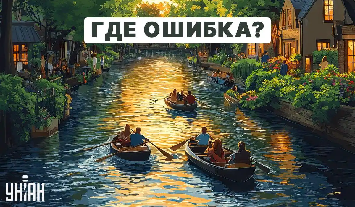 Davanti a voi c’è un’immagine che mostra un bel paesaggio di una città serale. Tra le case scorre un fiume su cui galleggiano persone in barca. A prima vista l’immagine sembra normale, ma in realtà contiene un errore grossolano.