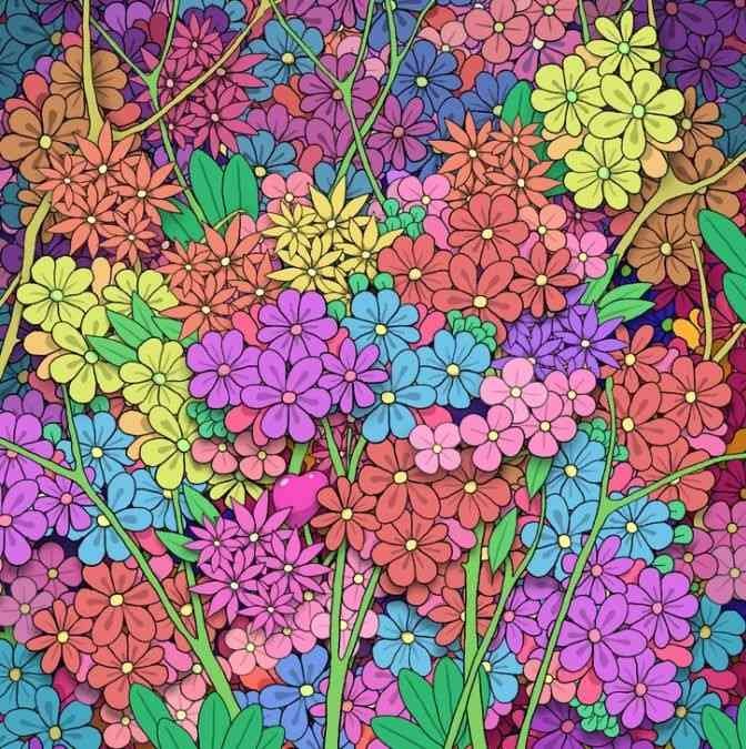 Nell’immagine vediamo fiori luminosi di diversi colori. I colori brillano dal rosso vivo al giallo, al blu, al rosa, al viola, al verde, ecc. In questa varietà di colori sarebbe difficile vedere ciò che è così accuratamente nascosto ai nostri occhi: il cuore.