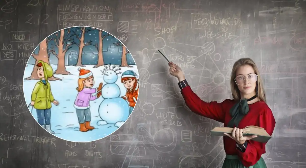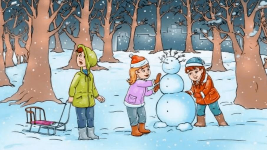 L’immagine mostra tre bambini in una foresta innevata: due stanno facendo un pupazzo di neve e uno ha in mano una slitta. Intorno a loro ci sono diversi alberi. In mezzo a questa scena si nasconde una renna.