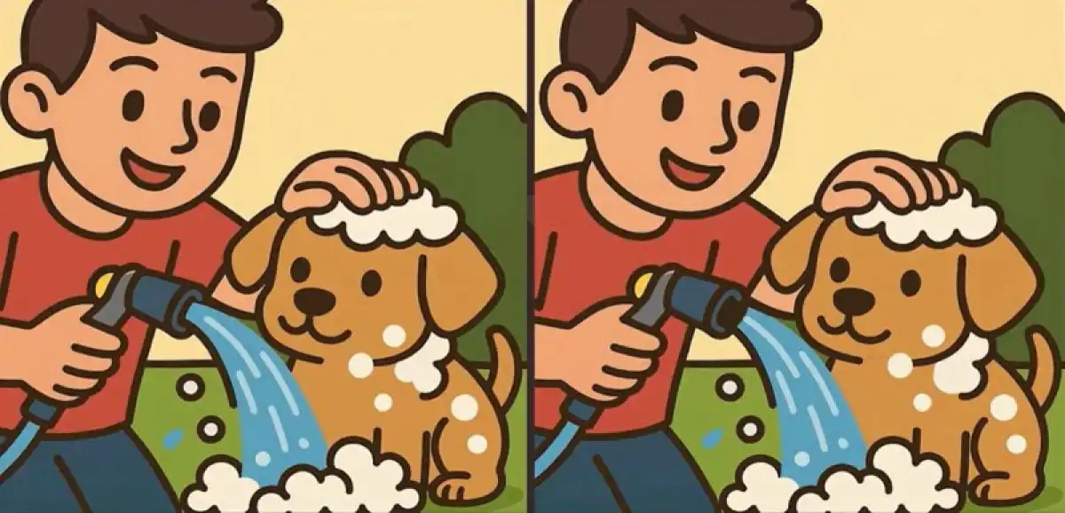 Siete pronti a mettere alla prova la vostra attenzione? Gdate queste due immagini di un ragazzo che fa il bagno al suo cane. A prima vista può sembrare che le immagini siano esattamente ugi, ma in realtà ci sono tre piccole differenze tra loro.