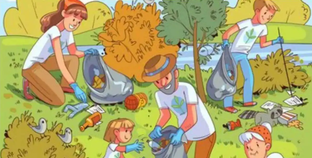 L’immagine mostra delle famiglie con bambini, che sono venuti al parco per pulire i rifiuti. Ci sono anche uccelli e un procione che osservano ciò che accade. Ma bisogna trovare la tartaruga.