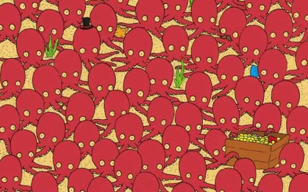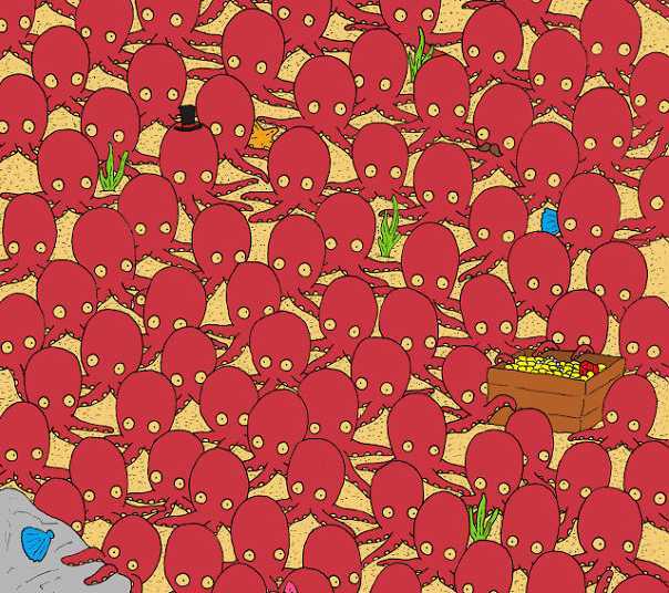 Provate a risolvere un’illusione ottica impegnativa ma divertente: il pesce tra i polpi è nascosto abbastanza bene, e dovete comunque cercare di trovarlo.