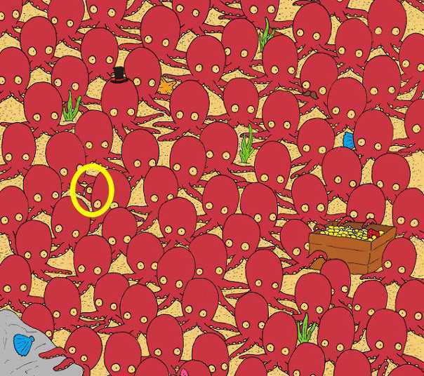 Non riuscite a trovare il polpo? Ecco un suggerimento: gdate al centro dell’immagine e poi un po’ più a sinistra. È lì che si nasconde il pesce. La risposta corretta è cerchiata in giallo.