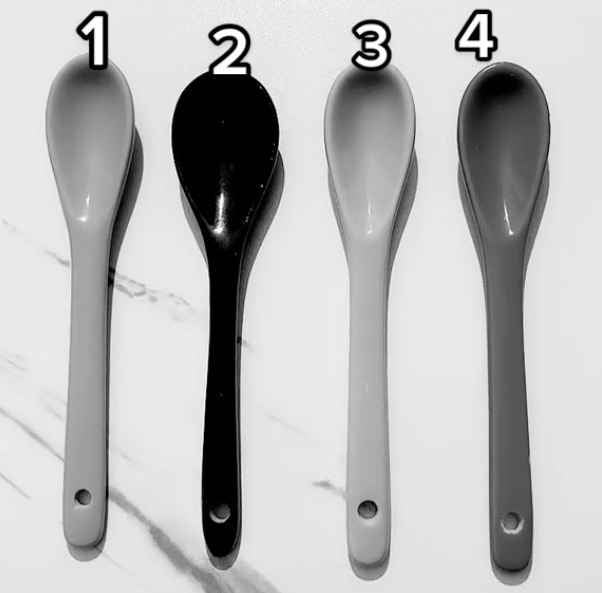 Nell’immagine vediamo qtro cucchiai, che indubbiamente hanno colori diversi. Ma la saturazione è stata rimossa dall’immagine, il che rende difficile capire immediatamente di che colore sia ognuno di questi singoli oggetti.